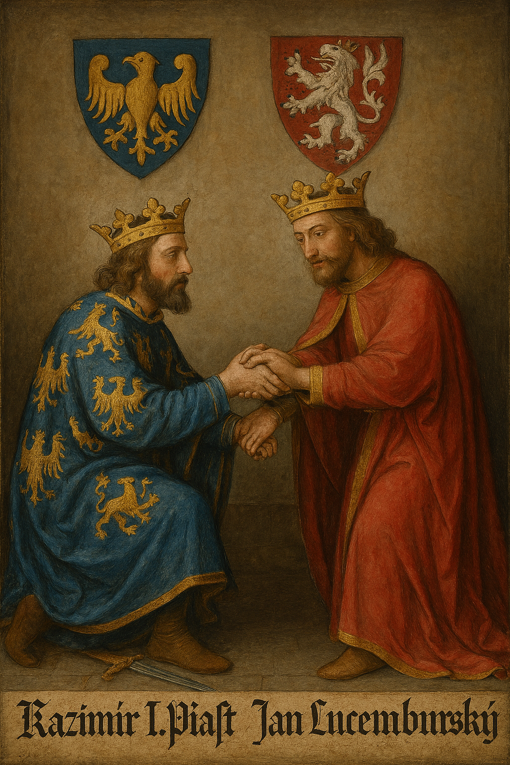 18. únor 1327 Opava: "Můj Otče, chci se stát tvým mužem", řekl Hornoslezský kníže Kazimír I. Piast svému novému pánu, českému králi Janu Lucemburskému. Poté kníže před králem poklekl, složil meč na zem a chytil se krále za ruce, jako projev bezbrannosti. "Vstaň můj Synu", odpověděl král knížeti a políbil ho na rty polibkem míru. Kníže Kazimír I. Piast tímto gestem převedl svou zemi z polské koruny pod korunu českou. Králi slíbil věrnost, radu a vojenskou pomoc v případě válek. Král zase knížeti slíbil trvalou ochranu. 24. února 1327 byla sepsána Lenní smlouva, kde král potvrzuje autonomii Slezska s jeho svrchovaným panovníkem, soudním tribunálem a biskupstvím. Kníže zase potvrzuje králův nárok na Slezsko v případě vymření slezské panovnické dynastie Piastovců, což se stalo až o 300 let později. Žádný z českých králů se tedy do té doby nestal svrchovaným panovníkem Slezska. Lenní smlouva byla notářsky stvrzena 30. srpna 1386 ve Fryštátě. Předáním slezského praporu králi, byl celý slavnostní akt ukončen.