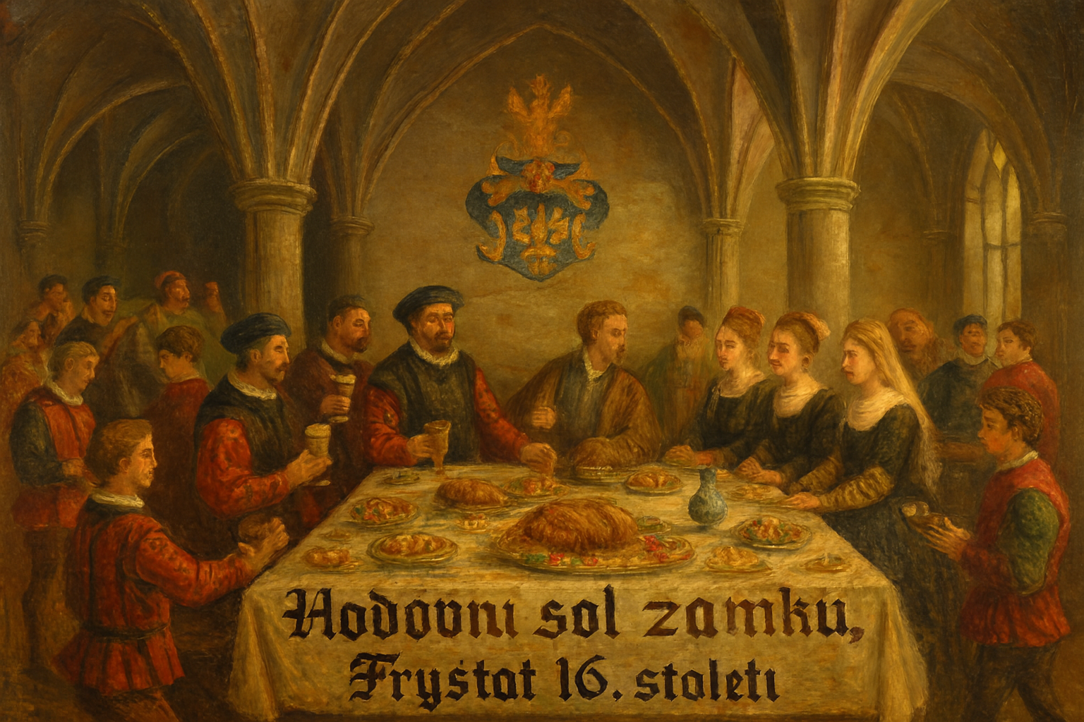 Na knížecí stůl ve Fryštátě se podávalo především maso, které se doplňovalo ovocem a zajídalo bílým nebo tmavým pečivem. Denní spotřeba masa tady byla půl kilogramu na osobu, hlavně to bylo maso hovězí a vepřové, méně často skopové. Mnohem častěji ale byla podávána drůbež, zejména slepice, kohouti a kapouni, kuřata, kachny a husy. Při slavnostních událostech se připravovala i zvěřina, od poloviny 16. století z vlastního chovu v Knížecí lovecké oboře v karvinském Louckém lese. V postních dnech, kterých bylo v roce asi 192, převažovali ryby nebo například luštěniny. V miskách se také podávali různé polévky, omáčky a ovocné kompoty, a pokud bylo k dispozici, hodovní stůl zdobilo i cizokrajné ovoce jako třeba pomeranče, fíky, granátová jablka či citrusové plody. Z příborů se používala lžíce a také napichovací nůž, ale jedlo se spíše rukama. U každé knížecí hostiny ve Fryštátě však proudem teklo víno či pivo z Fryštátského pivovaru a pokud byla hostina velká a slavnostní, obslužný personál doplňovali pážata, kteří vypomáhali s donáškou a servírováním jídel. Nebylo totiž přípustné, aby slezští panovníci na své jídlo a pití čekali. Přání všech hodujících musela být okamžitě splněna, snad ještě dřív než byla vyslovena, takže zdejší obsluha byla neustále ve střehu. Podávaného jídla bylo pokaždé až nad míru, jestliže totiž nějaké z pokrmů došlo, byla to pro slezský knížecí dvůr velká potupa a ve Fryštátě budované královské poměry tím mohly nesmírně utrpět. Její Milost slezská kněžna Eufemie II. zde také zavedla pravidlo, aby přebytečné jídlo, které se nesnědlo, bylo rozdáváno jako milodary chudině z Podzámčí. Během slavnostního hodování tady vždy hrála muzika a vystupovali s ní i kejklíři. Kliknutím na odkaz youtube si gotický taneček z 15. století můžete zatančit i Vy.
