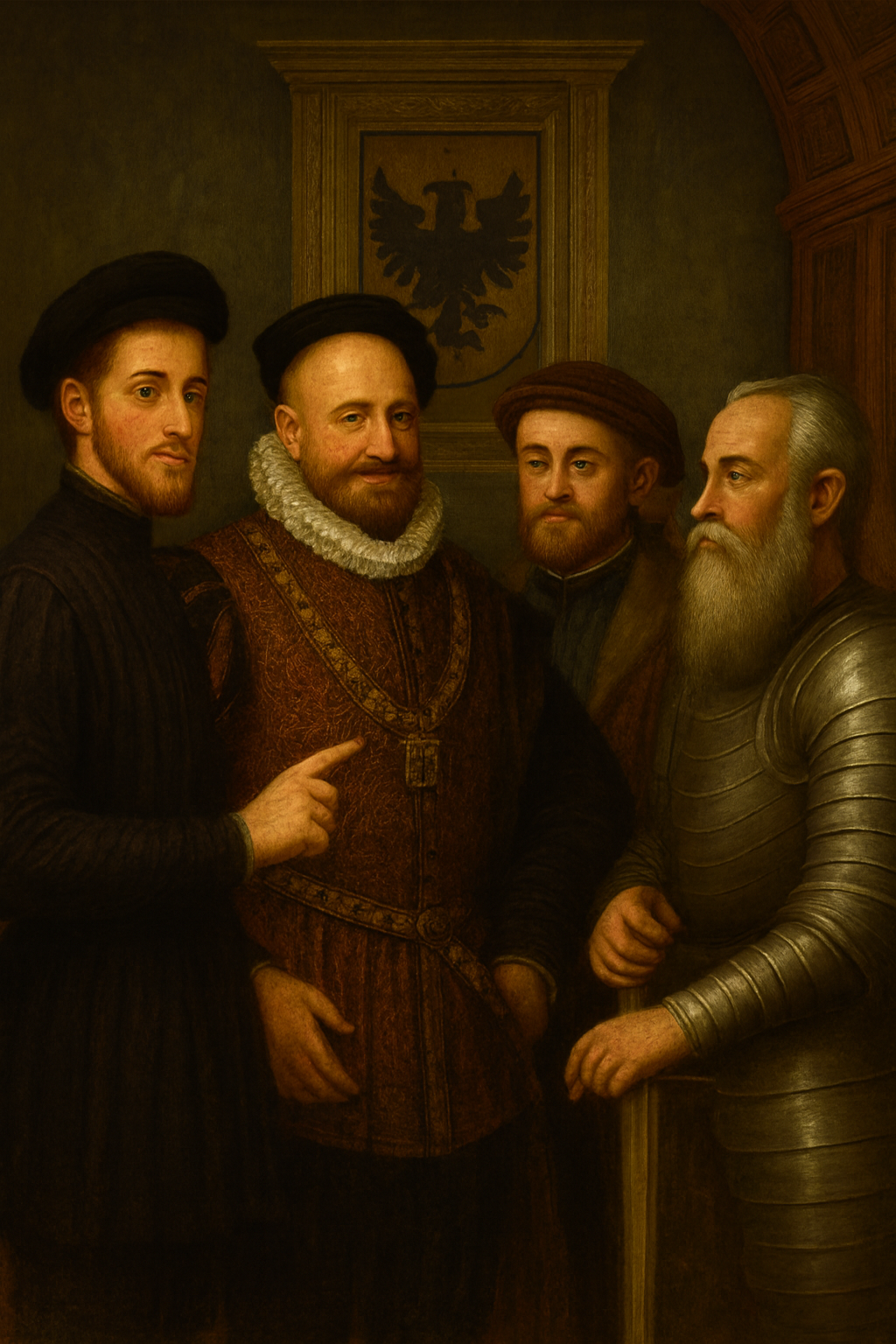 Uvolněné místo vrchního Štolmistra princ Fridrich přidělil šlechticovi, panu Arklebovi Pavlátovi z Olšan. Již léta slouží v knížecích honitbách a vyzná se u koní a loveckých psů. I on je povinnován zúčastňovat se ranního i večerního hodování. Princ Fridrich si k sobě ještě povolal dva mladé rytíře z elitní Fryštátské rytířské družiny. Rytíř Petr Pelko z Pelkova je šlechtic pocházející ze starého rodu Pelků, ze severu Polska. Ve Fryštátě tento rod žije už od konce 15. století, své sídlo má na svém zámeckém statku Miserov. Vlastní také lovecký zámek Malé Kunčice jen pár kilometrů od Fryštátu. Rytíř Petr je velmi rozvážný muž. Je spíš tichý, ale umí být vítanou společností. Je chytrý a vzdělaný. Ovládá své emoce a ví co dělá. Nikdy ho ale nepotkáte bez svého parťáka, Jiřího Rocnara z Rocnova, který byl do rytířského stavu uveden teprve nedávno. Povahou je pravým opakem rytíře Petra, je veselý a někdy rychleji jedná a mluví než přemýšlí. Ti dva jsou dokonalou, přesně sehranou dvojicí, kterou princ Fridrich bude využívat pro svá soukromá i oficiální poslání. Budou rychlou spojkou mezi princem Fridrichem a kýmkoliv a kdekoliv. Oba rytíři nejsou povinnováni zúčastňovat se vévodových hostin, ale příležitostně, především po vykonání významného poslání, budou k vévodovu stolu zváni. Princ Fridrich však pověřuje povinností zúčastňovat se večerních hostin i pana Martina Hanka, faráře fryštátského Zámeckého kostela, coby zástupce slezského biskupa Baltazara z Promnic ve Wroclawi. Častými hosty večerních hostin u vévodova stolu budou i vévodou pozvaní šlechtici a také i vévodou vybraný Purkmistr města Fryštátského, 50 letý pan Wolf ze Střítěže, šlechtic žijící ve Fryštátském domě se svou ženou. Pan Purkmistr odpovídá za organizační řád a pořádek ve městě a v jeho branách. Vládne rezidenčnímu městu spolu se třemi konšely, a vévoda Fridrich s nimi bude jednat ve věcech úředních především prostřednictvím svého úředníka, pana Jana Skočovského. Městská rada však také navštěvuje vévodu přímo na zámku při pravidelně se opakujících audiencích.