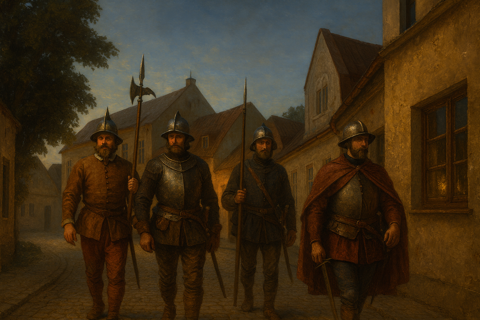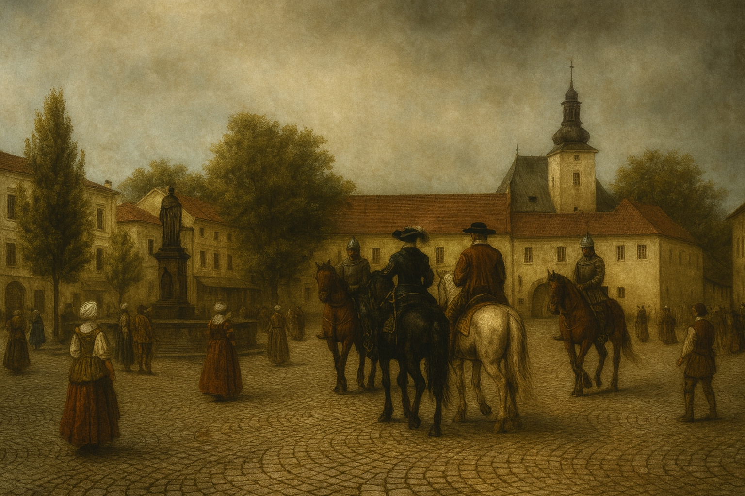 "No a pak tady máme početnou vojenskou stráž", pokračuje vévoda, "ochraňuje nejen Naši Milost a vévodské sídlo, ale také zámecké hradby, které jsou ovšem především hradbami městskými a vykonává a udržuje pořádek především ve městě. Pane Sekretáři, vyřídíte tedy městskému Purkmistrovi, panu Wolfovi ze Střítěže, že finanční náklady za vydržování vojenské stráže nyní přecházejí na městskou pokladnu a vysvětlete mu situaci. Stav městské pokladny rozhodně není nedostačující, a to jen díky Naší Milosti. To však panu fryštátskému Purkmistrovi neříkejte, myslím, že na to přijde sám," s úsměvem ukončí toto jednání vévoda. Pan Sekretář se Jeho Milosti vévodovi ukloní a odchází na Radnici rezidenčního města Fryštátu. Je to již 300 let stará budova, která zde stála ještě před založením rezidenčního města vévodovým prapředkem, vévodou Mečislavem III. Původně to byla venkovská chalupa, která se spolu s výstavbou rezidenčního města proměnila v měšťanský dům. Když v sousední budově roku 1447 vévodův prapraděd, vévoda Boleslav II. založil Zámecký pivovar, v měšťanském domě byl zprovozněn šenk rodiny Šlosarů. Před 65ti lety toto místo na rohu Radniční ulice a náměstí změnil vévodův praděd, slezský Vicekrál Kazimír II. Šenkovní dům od měšťana Jožka Šlosara koupil za 60 Zlatých a obratem ho za poloviční cenu prodal městské radě ke zřízení Radnice. Do té doby se Rada města Fryštátu scházela v pronajatých šencích nebo u některého radního v domě. Pan Purkmistr je volen do svého postu každý rok městskou radou a měšťany, ale někdy Purkmistra zvolí sám Jeho Milost vévoda. V každém případě vévoda zvoleného Purkmistra musí schválit. Páni Purkmistři jsou tak motivováni sloužit nejen městu, ale i vévodovi a vévoda této výhody nyní využívá ve svůj prospěch. Prostřednictvím svého Kancléře, pana Jana Skočovského, jedná na Radnici s panem Purkmistrem a jeho konšely. Když pan Kancléř radním vysvětlí situaci, a že tedy Jeho Milost vévoda již dále nebude vojenskou stráž podporovat z vévodské pokladny, dodává: "V opačném případě vojenská stráž bude značně omezena v pohybu po hradbách a na městských prostranstvích, ne-li zcela zrušena." Pan Purkmistr a konšelé vojenskou stráž pro udržení pořádku ve městě potřebují, takže si nejprve nechávají minutku na propočet nákladů za vojenskou stráž, kterou bude městská pokladna nyní zatížena, a s úklonou věnovanou panu Kancléři, coby vyslanci Jeho Milosti vévody, podávají tuto odpověď: "Pane dvorní Kancléři, jsme tedy Vámi obeznámeni s náhlou situací, která vede Jeho Milost vévodu k tomuto opatření. Městská pokladna se těší dobré finanční kondici a za tuto skutečnost jsme vděčni Jeho Milosti vévodovi. Návrh na převzetí finančních nákladů za vydržování vojenské stráže pohybující se na městských hradbách, v obou městských branách a na městských prostranstvích, po zvážení Rada rezidenčního města Fryštátu tento návrh přijímá."