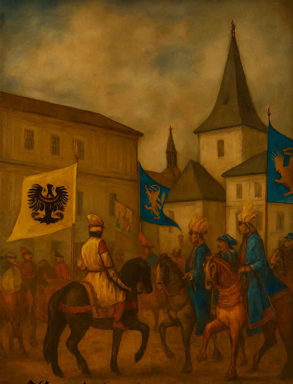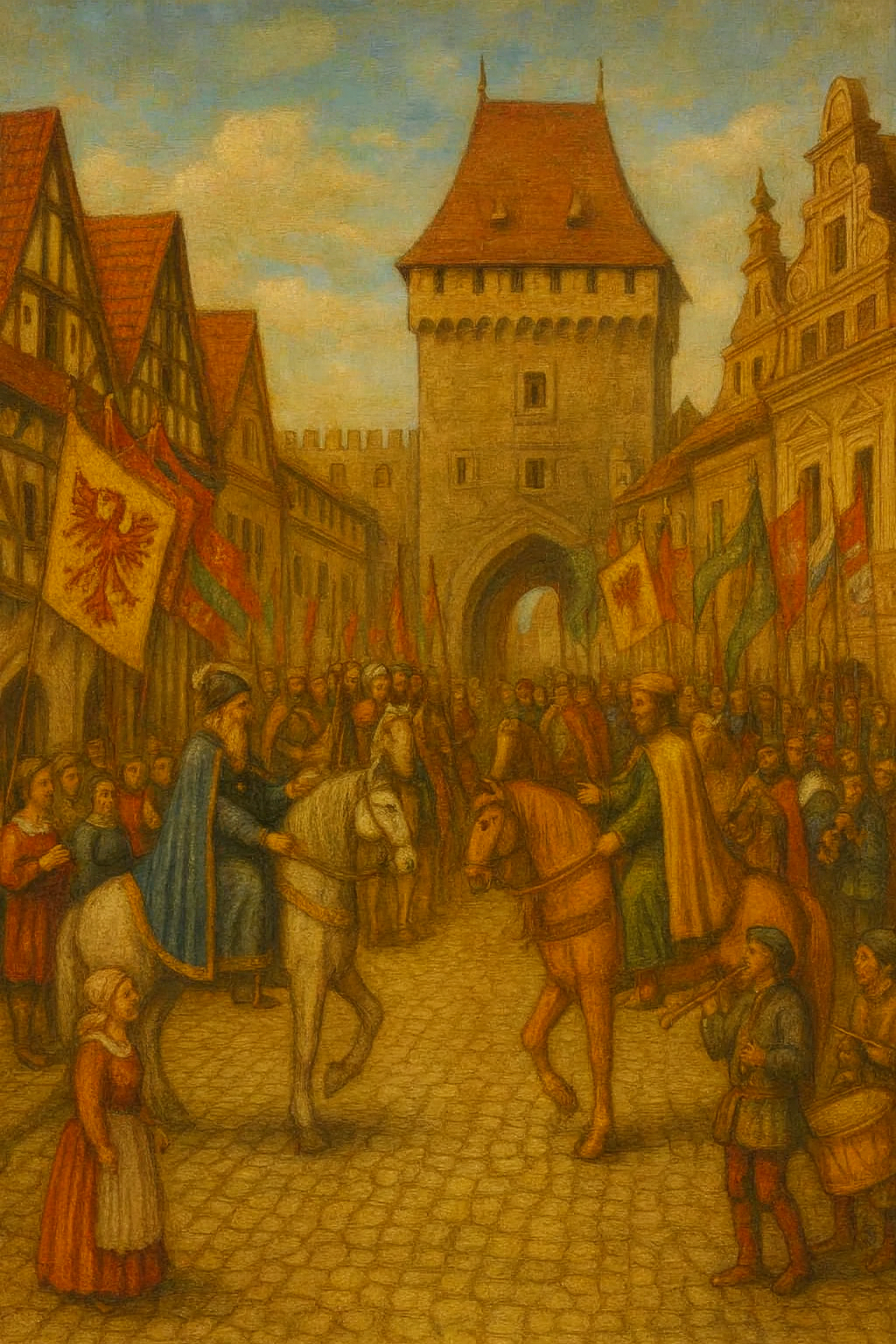 Na 8. září roku 1563 je vévoda Fridrich pozván ke korunovační ceremonii Jeho Veličenstva císaře Maxmiliána II. Habsburského v Prešpurku, kde je císař korunován Uherským králem. Vévoda proto pověřuje pana Maršálka přípravami na cestu, a s sebou vezmou i doprovodné pány rytíře z Rocnova a z Pelkova. Součástí průvodu budou i dva povozy s nákladem několika stanů k přenocování a třetí povoz se zásobami potravin, krmiva pro koně a jiných potřebných věcí. Bude je doprovázet i nevelký průvod složený z několika mužů zbrojní stráže, čeledíni a personál kuchyně. Průvody vedené mimo domovské slezské území jsou náročné na přípravu i cestu samotnou. Cesta do Prešpurku bude dlouhá, pojedou pomalu, podle možnosti jízdy povozů a každý večer před setměním zastaví na vybraném místě, kde čeledíni postaví stany k přenocování. Hlavní stan pro vévodu Fridricha a jeho Komorníka pana Milického, druhý stan pro pana Maršálka ze Slupska, třetí stan obývají vévodovi rytíři Jiří z Rocnova a Petr z Pelkova a ještě další stany, ve kterých společně přenocuje zámecká zbrojní stráž s čeledíny. Vévoda se s členy svého průvodu bude stravovat z vlastních zdrojů připravených v polní kuchyni, která také pojede s nimi. V Uhrách ztratila svou moc královská dynastie Zápolských, kterou založil bohatý uherský magnát Štefán Zápolský se svou chotí, vévodovou pratetou Hedvikou Piastovnou. Ta vyrůstala na dvorech v Těšíně a ve Fryštátě a po dosažení její plnoletosti roku 1486 ji vévodův děd Kazimír II. provdal do Uher, kde se stala matkou uherského krále Jana Zápolského a polské královny Barbory Jagellonské. V Uhrách vlastnila několik hradů, včetně Spišského a Trenčínského, kde by mohl vévoda Fridrich přenocovat, ale nyní to už není možné. Na cestu se z Fryštátu vydávají již několik dní před korunovací. V Prešpurku se vévoda pohybuje v těsné blízkosti Jeho Veličenstva císaře Maxmiliána a spolu s jinými panovníky císařství Maxmiliánovi pomáhají s osobními přípravami na korunovaci, oblékají ho do korunovačního oděvu a k císařově okázalosti ho také všude doprovázejí. Po korunovaci se průvod vévody Fridricha vydává stejnou cestou zpátky do Fryštátu. Mají s sebou nového cestujícího - vévoda Fridrich od Lombardského vévody koupil dvorního trpaslíka, kterého si Lombardský vévoda do Prešpurku vzal s sebou. Jistě bude milým dárkem pro Fridrichovu nastávající manželku, princeznu Kateřinu.