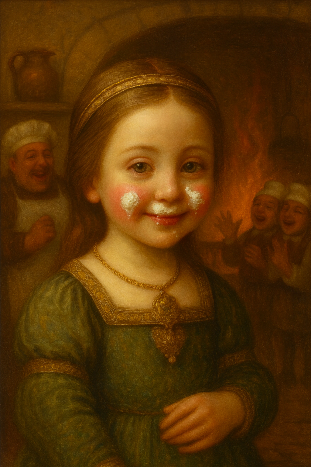 Často si však pro dobré jídlo princezna přijde sama do kuchyně. "Hledám svůj míč", odpovídá princezna na dotaz Kuchmistra. Jenže princezna lhát moc neumí a proto její pravý důvod návštěvy zámecké kuchyně je vždy brzy odhalen. "Kdepak jsem ho jen nechala? Kam se mi ten míč mohl zakutálet?", pokračuje v lhaní princezna. Je rozená diplomatka. "Vaše Milosti", odpoví jeden z kuchtíků, "myslím, že jsem nějaký míč zahlédl v kredenci. Nebo se mi to jen zdálo?" Kuchtík taky reaguje lží, to aby, jak se říká, mu princezna skočila na špek. Ale je to lež milá, protože princezna má kuchtíky moc ráda a i kuchtíci by za malou princeznu položili své životy. Princezna se tedy jde podívat do kredence. Kredenc má velké dveře, takže když je princezna otevře, není ji vidět. Ale co nevidí ona! Na polici kredence je na tácku položeno pár malých zákusků čerstvě nazdobených šlehačkou. Všichni v kuchyni jí nenápadně pozorují. Malá princezna tajně jeden ze zákusků sní, ale nevšimne si, že jí tvář zůstala upatlaná od šlehačky. Když spolkne poslední sousto zákusku, elegantně, jako by nic, zavře dveře od kredence a říká: "Ani tady není. Tak kde ten míč může být?" Když se ukáže Kuchmistrovi a kuchtíkům, všichni se dají do ohromného smíchu. Princezna je uvedena do rozpaků, ničemu nerozumí, vždyť ji nikdo nemohl vidět sníst ten zákusek. Když nevidí ona je, nemůžou vidět oni ji. "Princezno", přetne smích kuchtíků pan Kuchmistr, "tak jsem nedávno slyšel, že se Fryštátským zámkem po chodbách prochází strašidlo Šlehačkožrout, dejte si na něho pozor. Jestli ho totiž potkáte, mohl by Vám ukousnout nos!" A všichni v kuchyni se dají do ještě většího smíchu. Teď už princezna opravdu ničemu nerozumí. Proč se všichni smějí?, zeptá se sama sebe. "Tak už ji nechte", ukázní paní Kuchmistrová všechny pány v kuchyni. "Chcete ji vyděsit? Vždyť se jí o tom bude zdát a dostane strach, chudinka." Domluví paní Kuchmistrová a jde do kredence pro zbytek zákusků. "Vemte si je, Princezno", podá ji ty zákusky a zástěrou princezně utře obličej. "Jsou moc dobré a pan Kuchmistr je dělal jen pro Vás." Malá princezna si zákusky vezme a v doprovodu dvorní chůvy pomalu opouští zámeckou kuchyň. Ve dveřích se však zastaví, otočí se směrem k panu Kuchmistrovi a zdvořile poděkuje: "Velmi moc vám děkujeme za milé pohoštění. A nemějte o Nás strach. Já se strašidel nebojím", říká princezna a ještě dodá: "Velmi ráda vás zase někdy navštívím." "Budeme za Vaši milou návštěvu velmi vděční a bude pro nás velkou ctí, Vaše Milosti", odpoví zdvořile a s upřímným úsměvem na rtech pan Kuchmistr. Vždyť je vždycky rád, když malou princeznu vidí. Její návštěvy zámecké kuchyně jsou potěšením, a zkrášlením každého dne pro všechny. Tak nějak podobně se toto odehrává téměř den co den.