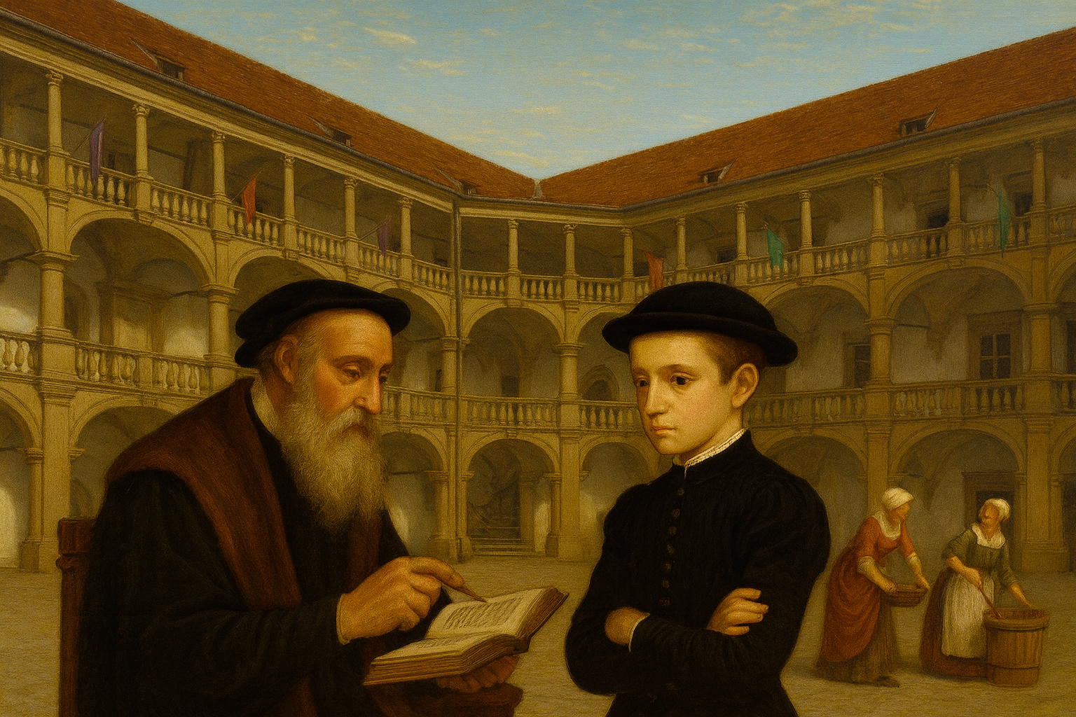 Den za dnem ubíhají a princ je stále více ponořený do intenzivního studia. Někdy ho to nebaví, jindy se nudí, ale protože si princ uvědomuje, že tady nemá žádnou jinou aktivitu, snaží se být disciplinovaný a dávat při studiu pozor. Ač je princ ještě dítě, přeci jen se v něm nezapře, že pochází z nejvýše postaveného aristokratického rodu a že jeho budoucností je být panovníkem ve Slezsku. Během těch prvních několika zde strávených týdnů si princ Fridrich všímá, že den co den na nádvoří zámku posedává chlapec přibližně stejného věku. Vlastně ani neví, kdy přijde a kdy zase odejde, ale je tady a jen sedí. Tu a tam ho někdo osloví, ale jinak nic víc. Fridrich tedy jednoho dne za chlapcem přichází. "Co tady děláš?", zeptá se princ docela nezdvořile a autoritářsky. "Ještě mě odsud nikdo nevyhodil, tak proč tě to zajímá?", odpověděl zatrpkle chlapec. "Jak se jmenuješ?" "Jakub. Jakub Preiss, jsem synem městského učitele a kazatele." "Jsem rád, že tě poznávám, Jakube", odpověděl princ a tentokráte už přátelštěji. "Já jsem...", "Já vím kdo jsi", "Jak to víš? Vždyť já tě neznám." "Mě nikdo nezná, ale tebe znají všichni, všichni vědí kdo jsi, Milosti", odvětil Jakub a tak trochu se do Fridricha naváží. "Můžeš mi říkat Fridrichu, tak se jmenuji. Můžeme být kamarádi, chceš?" Jakubovi se rozzáří oči, jen přitaká a nic neříká. Princ Fridrich na nic nečeká, chytne Jakuba za ruku a provede ho zámkem. Tedy jen stájemi, zbrojnicí a nakonec skončí v kuchyni, protože zámecký kuchmistr má pro Fridricha vždycky něco přichystaného. "Přivedl jste si kamaráda, princi?" reaguje kuchmistr. "Ano, on tady teď bude se mnou často. Jmenuje se Jakub, je synem učitele a kazatele." "Vždyť ho znám. Skoro každý den tě Jakube vidím na nádvoří. Řekni mi, líbí se ti zámek?" "Ano, je moc krásný, taky bych chtěl mít takový." Kuchmistr se jen pousměje a vytáhne z vyhřáté pece ještě teplé voňavé koláče. "Tak si berte chlapci."