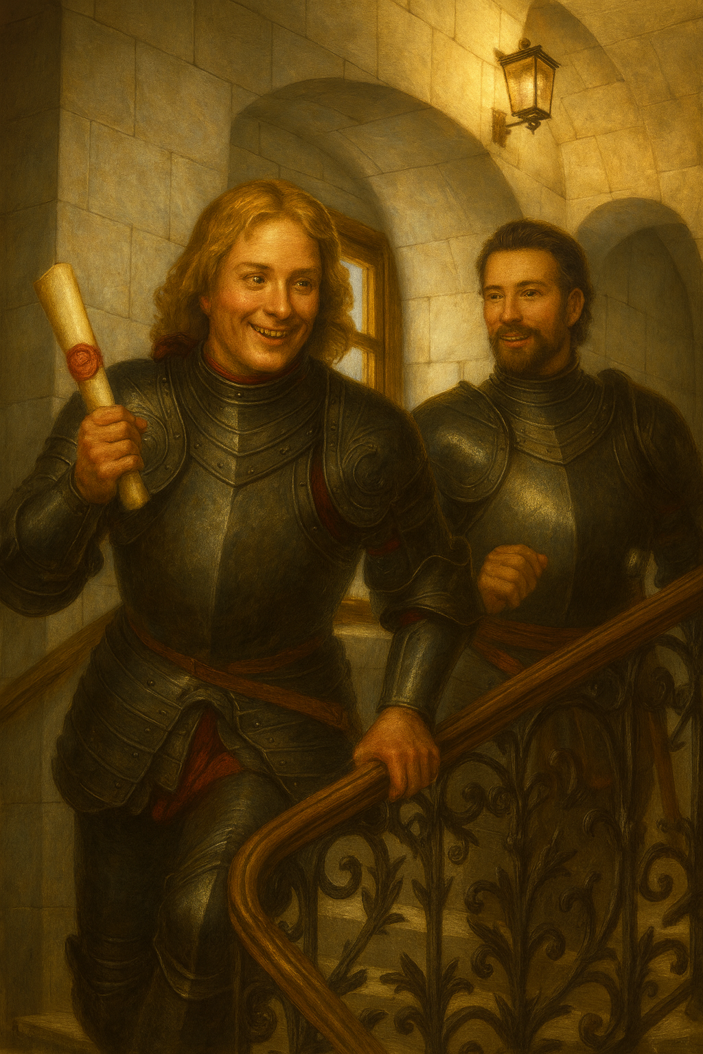 Při ranním nástupu všech fryštátských rytířů, pan Maršálek jménem Jeho Milosti vévody Fridricha, děkuje přítomným svatebního průvodu a zároveň rytíře informuje o jejich jarním opětovném povolání k doprovodu Její Milosti vévodkyně Kateřiny z Lehnice do Fryštátu. Když pan Maršálek skončí ranní promluvu k rytířům, provolá: "Rytíř Petr Pelko z Pelkova!" "Zde!" "Rytíř Jiří Rocnar z Rocnova!" "Zde!" "Ihned po rozchodu se budete hlásit u Jeho Milosti vévody! Rozchod!" Oba rytíři tedy sesednou z koně a pan Maršálek je doprovodí do Trůnního sálu Fryštátského zámku, kde je před vstupem do sálu hlasitě ohlásí vévodův dvorní Komorník pan Tomáš Milický z Jilemnice: "Pan Maršálek Václav ze Slupska s pány rytíři Jiřím Rocnarem z Rocnova a Petrem Pelkem z Pelkova!" Vévoda když je uvidí, vzpomene si, jak mu v Břehu rytíř z Rocnova předváděl svého strýce coby medvěda a nenápadně se usměje. Rytíři se po příchodu k trůnu Jeho Milosti vévodovi Fridrichovi hluboce ukloní a čekají na sdělení Jeho Milosti. "Přátelé, sloužíte mi věrně už několik let a při posledním vašem poslání jste se skutečně vyznamenali. Předvším pan rytíř z Rocnova. Co myslíte, pane Maršálku, není to příhodná chvíle, aby Naše Milost panu rytíři projevila štědrost?" Pan Maršálek se souhlasně a s úklonou usměje, ale rytíř z Rocnova nic takového nečekal a je zcela zaskočen. "Pane z Rocnova, je nějaký sen či nějaké vaše přání, které vám dosud nebylo splněno?" "Sire, mou největší dosavadní ctí je být Vaším pokorným služebníkem, všechny mé sny jsou vedle této cti ničím", řekl vskutku velice skromně Jiří. "Sire, dovolte mi promluvit", skočí jim do řeči rytíř Petr z Pelkova. "Jen mluvte, příteli."