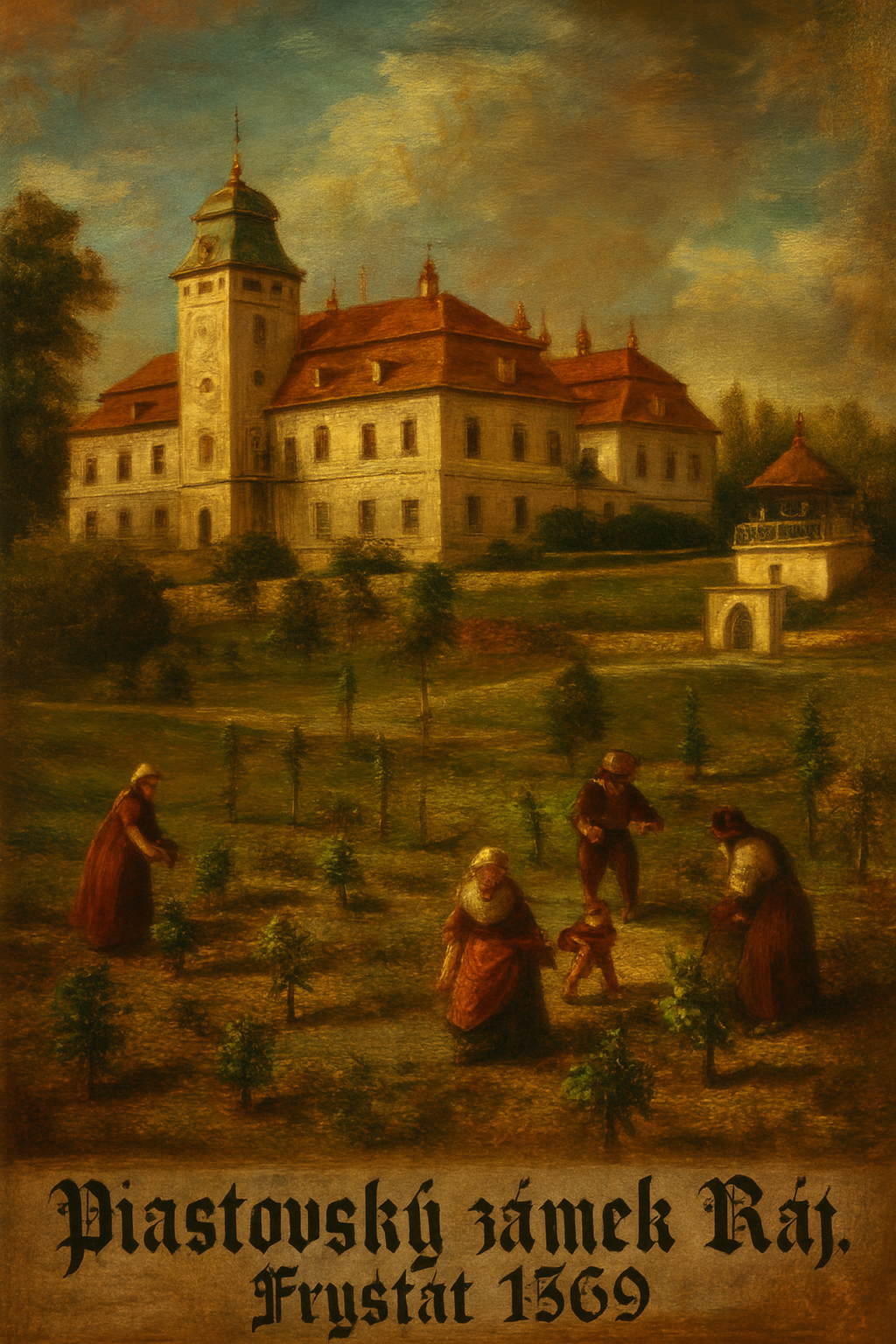 Zámek Fryštát má kromě svého nádvoří také krásnou zahradu, která pod zámkem přechází v krajinu loveckých revírů. Dnes v něm nikdo neloví. Všichni oslavují uvedení vévodkyně Kateřiny v jejím novém domově, který se jí hned na první pohled zalíbil. Zahrada pod zámkem je velice krásná a láká k procházce. Před 50ti lety ji založil vévoda Kazimír II. když celý zámek přestavoval do dnešní podoby. Vévoda Fridrich spolu s vévodkyní Kateřinou budou zahradu často navštěvovat k procházkám a doprovázet je budou všichni dvořané. I dnes, v době konání svatebního veselí je zahrada plná dvořanů a pozvaných šlechticů, kteří se potřebují trochu projít. Na hodovních stolech je spousta jídla a pití, oslavy trvají celý den a proto procházka zahradou je vítaným protažením těla.