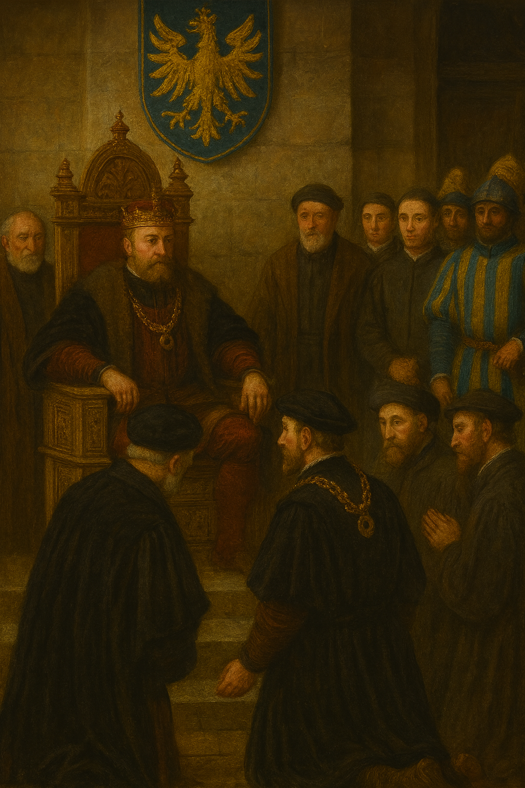 K vévodovi Fridrichovi také na zámek přicházejí z Radnice fryštátští městští konšelé vedeni fryštátským panem Purkmistrem Wolfem ze Střítěže. Předmětem jejich návštěvy zámku je pravidelné jednání s Jeho Milostí vévodou. Než panstvo vstoupí do Trůnního sálu, kde na trůnu sedí vévoda Fridrich obklopen dvořany a úředníky, pan Komorník Tomáš Milický hlasitě ohlásí jejich příchod: "Pan Purkmistr Wolf ze Střítěže s doprovodem pánů konšelů města Fryštátského!" Pánové radní nato vstoupí do Trůnního sálu, a když jím procházejí k Jeho Milosti vévodovi, jsou malou úklonou zdraveni všemi přítomnými. Poté co se páni radní postaví před Trůnem s vévodou, hluboce se Jeho Milosti ukloní a začnou jednání: "Sire," začíná jednání pan Purkmistr Wolf ze Střítěže, "Fryštát, který je rezidenčním sídlem Vaší Milosti, velmi těží z přítomnosti dvora Vaší Milosti. Prosperuje, je hojně navštěvován kupci z celé Evropy, řemeslům a cechům se daří a jeho obyvatelé zažívají mír a blahobyt. Jsou zde však takový, kteří se z této prosperity obohacují a předražují své zboží a služby. V Evropě dobrá pověst rezidenčního města Vaší Milosti tak může být poškozena." "Buďte konkrétnější, pane Purkmistře," reaguje vévoda a pokračuje: "sdělte Nám více informací a co je potřeba udělat pro nápravu věci." "Sire," pokračuje ve stížnosti pan Purkmistr, "v této listině jsem sepsal seznam obchodníků, kteří ve Fryštátě předražují své zboží a služby a dokonce nutí ostatní, aby své zboží zdražovali také, a někteří se k nim opravdu přidali. Fryštátu tak hrozí, že se mu kupci budou vyhýbat a lidé budou nakupovat v jiných městech." "Pane Purkmistře, děkuji vám za sdělení a sepsání listiny, kterou se Naše Milost bude neodkladně zabývat a v co nejkratším čase dáme viníky potrestat i pro výstrahu ostatním. Naším záměrem je budovat dobrou pověst Fryštátu, který je rezidenčním městem Naší Milosti, a kdo se snaží poškodit jeho pověst, poškozuje i pověst Naší Milosti. Věc dáme do pořádku." "Velmi Vám, Sire, děkujeme a jsme Vám vděční za Vaši prozřetelnost", děkuje s velmi hlubokou úklonou pan Purkmistr a konšelé se vévodovi uklánějí spolu s ním. "Dále tady máme spor s panem rytířem Jiřím Pilarem z Pilchu, který patří Vaší Milosti," pokračuje v jednání pan Purkmistr. "O jaký spor se jedná, pane Purkmistře?" Odpoví vévoda a vybízí pana Purkmistra aby pokračoval. "Pan rytíř Pilar si přivlastnil pozemky patřící rezidenčnímu městu Fryštátu, které sousedí s pozemkem pana rytíře Pilara. Já, pokorný služebník Vaší Milosti, spolu s pány městskými konšely věc projednáváme s panem rytířem Pilarem, abychom nezatěžovali Vaší Milost, ale pan Pilar není jednání příliš nakloněn, nechová se v souladu se svým rytířským stavem, a proto spor podstupujeme Vaší Milosti. Věříme, že Vaše Milost tento spor rozhodne." "Ano pane Purkmistře, i tímto sporem se Naše Milost bude zabývat. Je-li právo na straně města Fryštátu, bude rozhodnuto ve prospěch města Fryštátu a rytíř Jiří Pilar z Pilchu bude náležitě potrestán odejmutím rytířského stavu." Těmito slovy vévoda ujišťuje pana Purkmistra i městskou radu, že mu není lhostejné jednání rytířů, patřících do elitní rytířské jednotky Jeho Milosti a pokračuje dále: "K záležitostem, které jsme projednávali dříve, mám pro vás pane Purkmistře, dobré zprávy. Naše Milost v této listině potvrzuje všechna vysoká privilegia, práva a svobody rezidenčnímu městu Fryštátu náležícímu mezi slezská vévodská sídla, která byla již dříve městu Fryštátu udělena Jejich Milostí Hornoslezskými vévody. Pro další rozvoj rezidenčního města Fryštátu, Naše Milost požádala Jeho Veličenstvo císaře o povolení zavedení dalších dvou výročních trhů, a sice výročních trhů na den apoštolů sv. Simona a Judy, a na den sv. Pavla. Vše je uvedeno v této druhé listině Jeho Veličenstva císaře a podepsáno Naší Milostí. Rezidenční město Fryštát musí prosperovat a jeho obyvatelé musejí žít v celkové spokojenosti a blahobytu. Taková je vůle Naší Milosti. Kdo si zaslouží odměnu, dostane ji, kdo však všeobecné blaho narušuje, bude potrestán městským katem z nařízení Naší Milosti." Těmito slovy vévoda končí každé jednání s městskou radou. Pan Purkmistr Wolf ze Střítěže, i jeho konšelé se vévodovi hluboce a s vděčností pokloní, ať už byla jejich záležitost vyřešena nebo ne.