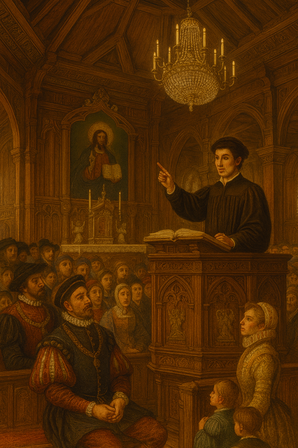 Brzy po narození a křtinách princezny Kateřinky jde vévoda Fridrich s vévodkyní Kateřinou poprvé navštívit kázání Jakuba Preisse z Břehu. Kázání se před nedávnem začaly konat pravidelně v odpoledních hodinách v novém kostele svatého Marka za hradbami Fryštátu, který byl vévodou Fridrichem určen k evangelickému kázání pastora Jakuba, jak se Jakubovi začalo ve Fryštátě říkat. Kostel je vždy plný obecného lidu, měšťanů i šlechticů, protože evangelická kázání jsou ve Slezsku velice oblíbená. "Na počátku Bůh stvořil Nebe, Zemi a život v nich", začíná kázání pastor Jakub, "stvořil také první lidi, Adama a Evu. Měli od Boha za úkol naplnit Zemi a pečovat o ni. Dostali však od Boha také tento jednoduchý zákon: Nesměli jíst ovoce ze stromu Poznání. Satan však Adama a Evu svedl k hříchu a oni ze stromu jeho ovoce pojedli. Bůh je tedy vyhnal ze zahrady Eden, ale dále se o ně staral dokud nezemřeli. Protože zhřešili, ztratili možnost žít na Zemi věčně. Tuto možnost ztratili i všechny jejich děti, protože se jim rodili už nedokonalé a se sklonem hřešit. Když naplnili Zemi, začali dělat velmi špatné věci a Bůh se rozhodl, že všechen život na Zemi zničí. Jedině Noe se svou rodinou nedělali špatné věci a tak Bůh Noema pověřil postavit velkou Archu, ve které měli být zachráněni všichni spravedliví lidé a zvířata. Avšak jen Noe s rodinou vešli do Archy, nikdo jiný neměl zájem a ještě se všichni Noemovi smáli. Tak se Archa zavřela a začalo na Zemi pršet až nastala velká potopa, při které zahynuli všichni lídé a zvířata, která nebyla v Arše. Po potopě Bůh pustil Noema a jeho rodinu z Archy ven a dal jim příkaz, aby opět naplnili Zemi. Všichni však měli stále poslouchat Boha. Když byla Země opět naplněna lidmi, Satan zase začal svádět lidi dělat špatné věci a hřešit. Tak Bůh poslal na Zemi svého syna Ježíše Krista. Ten lidem kázal, aby činili Boží vůli a nehřešili. A ti, kteří budou Bohem uznáni za spravedlivé, budou na Zemi žít věčným životem, až Bůh znovu a tentokráte již naposledy zničí všechny špatné lidi i se Satanem. Proto vám káži, moji milí a drazí bratři a sestry, čiňte pokání ze svých špatných skutků a obraťte se plně k Bohu, svému Otci a Stvořiteli. Odvraťte se od Satana a nenechte se jím zlákat ke konání špatností. Čtěte si Bibli každý den, a kdo nemá Bibli, naslouchejte Božímu slovu tady na našich shromážděních."